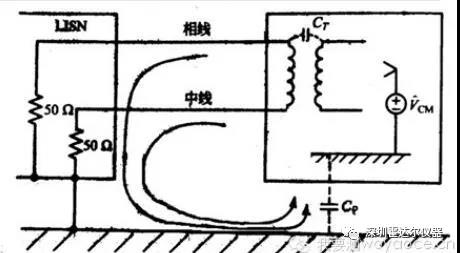 分析:上图是样品不带地线时,传导测试的简化原理,EUT产生的工模骚扰,经过50欧姆阻抗,然后通过实验室接地铜板和EUT共模骚扰地之间形成的耦合电容CP,形成骚扰回路,接收机测试到的信号就是50欧姆阻抗上的压降。那么,接入地线以后,以上的测试过程有哪些变化呢?请看下图: